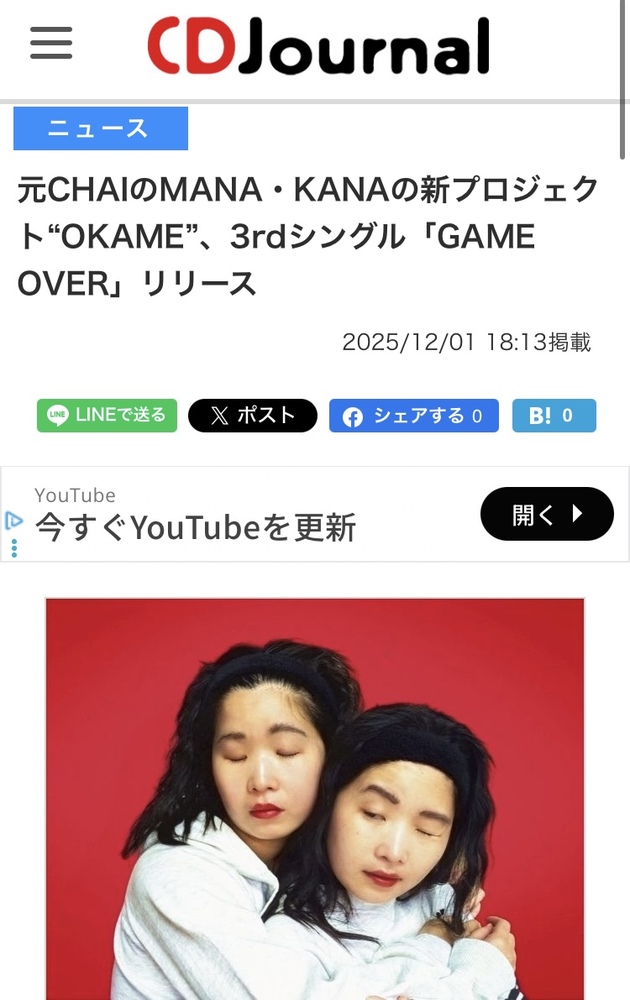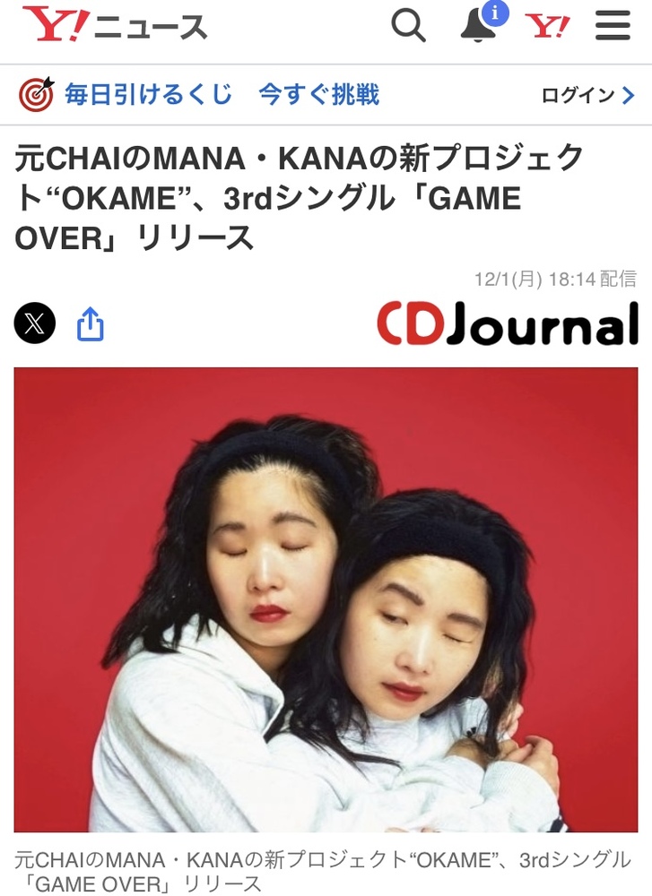 元CHAIのMANA・KANAの新プロジェクト“OKAME”、3rdシングル「GAME OVER」リリース NEWS MANA KANA OFFICIAL SITE 2025/12/01 20:12 フォロー https://news.yahoo.co.jp/articles/cb19d8522b506dd74e774099686059cb3ae1bcdc URLをコピーする 報告する