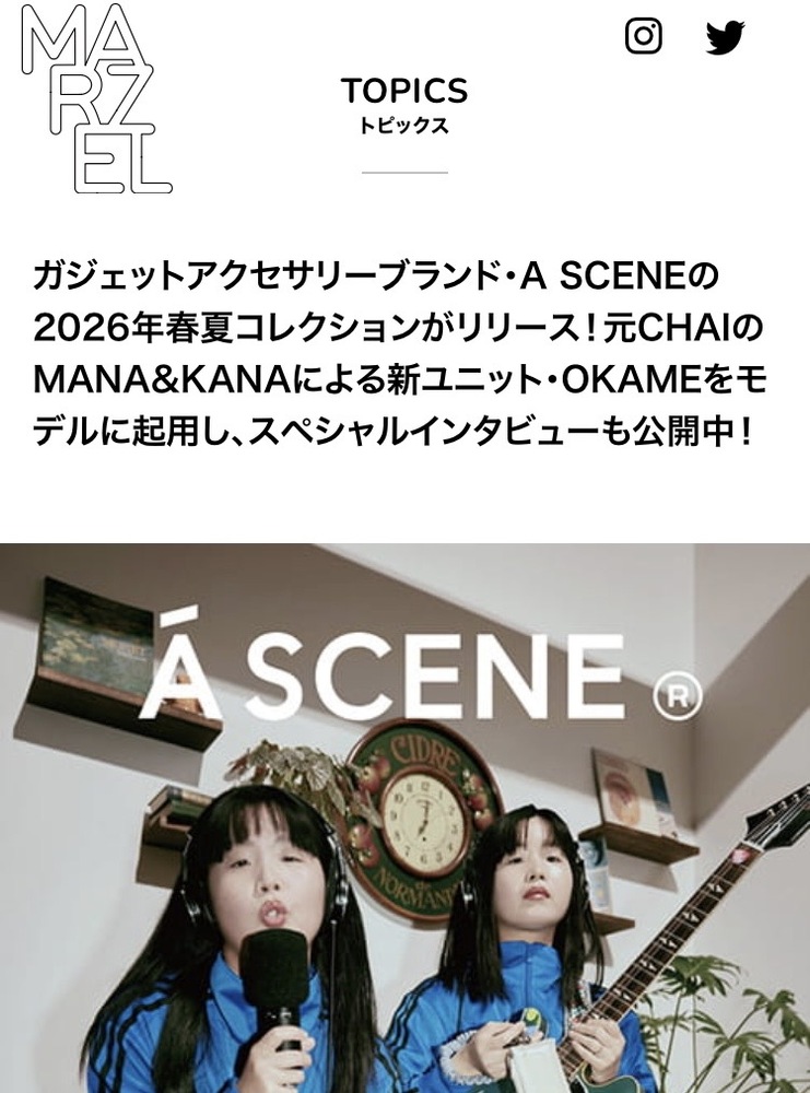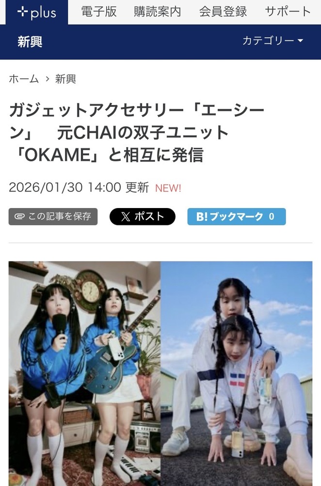 ガジェットアクセサリー「エーシーン」 元CHAIの双子ユニット「OKAME」と相互に発信 NEWS MANA KANA OFFICIAL SITE 2026/01/30 16:26 フォロー https://senken.co.jp/posts/park-creation-260130 URLをコピーする 報告する